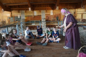 Der Rundgang führte weiter durch das Speisezimmer, die Küche und Lagerräume, die Schlafzimmer und die Räumlichkeiten der Sklavinnen und Sklaven. Die antike Fußbodenheizung, die Toiletten, den Hausaltar, die Deckenmalereien können dort noch heute bestaunt werden. Graffiti an den Wänden, die Kinder an die Wände geschrieben haben, geben Aufschluss darüber, wie streng ihr Hauslehrer beim Schulunterricht gewesen ist. Die Techniken, wie die Landgüter gebaut und die Dachziegel hergestellt wurden, werden genau beschrieben: Zu sehen sind auch noch Fußspuren von Tieren, die während des Trocknens der Ziegel darüber gelaufen sind. In der Spielecke konnten die Schüler nach den Führungen noch einige Spiele ausprobieren, die die römischen Kinder zum Zeitvertreib gespielt haben.