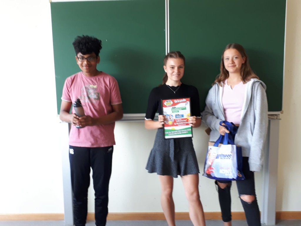 Nichtsdestotrotz nahmen die Schülerinnen und Schüler die Preise mit Stolz und gebührendem Abstand in einer Biologiestunde von Frau Ervens entgegen. Als Siegerpreise gab es jeweils eine Urkunde, T-Shirts mit UV-Schutz von IQ-UV, Pflegeprodukte von dm sowie faltbare Trinkflaschen von der BARMER. Hautschutz so selbstverständlich wie Zähneputzen!