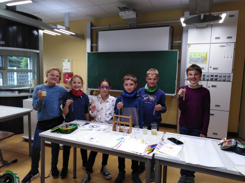 Beim diesjährigen Chem-pions Wettbewerb geht es rund um die Zauberstifte, die durch einen Magic-Pen ihre Farbe verändern. Dem Grund hierfür gingen sechs neugierige Forscher*innen aus der 5b auf die Spur. Für sie war es ein erstes Experimentieren am FMG im Chemieraum.