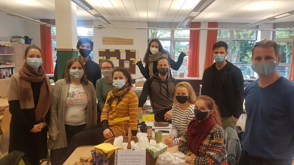 Am 09.11.2020) feierten die neuen Lehramtsanwärter*innen Herr Büchsenschütz (E/SW), Frau Dreßler (F/SP), Frau Freining (KU/CH), Frau Finke (E/BIO) Frau Sampels (E/EK), Frau Tokul (D/PI), Herr Weisz (GE/SP) und Herr Klinkenberg (D/GE) mit einem kleinen Buffet ihren Einstand am FMG. Das Kollegium möchte sich auf diesem Wege ganz herzlich dafür bedanken und wünscht ihnen alles Gute und viel Erfolg bei ihrer Ausbildung.