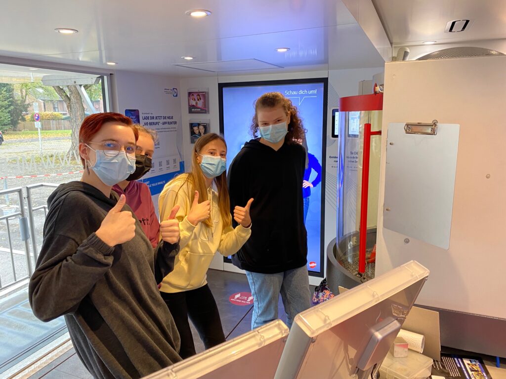 In dieser Woche war der M + E-Infotruck auf unserem Schulgelände. Die Neuntklässler konnten sich umfangreich über Berufsfelder und Karrieremöglichkeiten in der metallverarbeitenden Industrie und der Energiewirtschaft informieren.