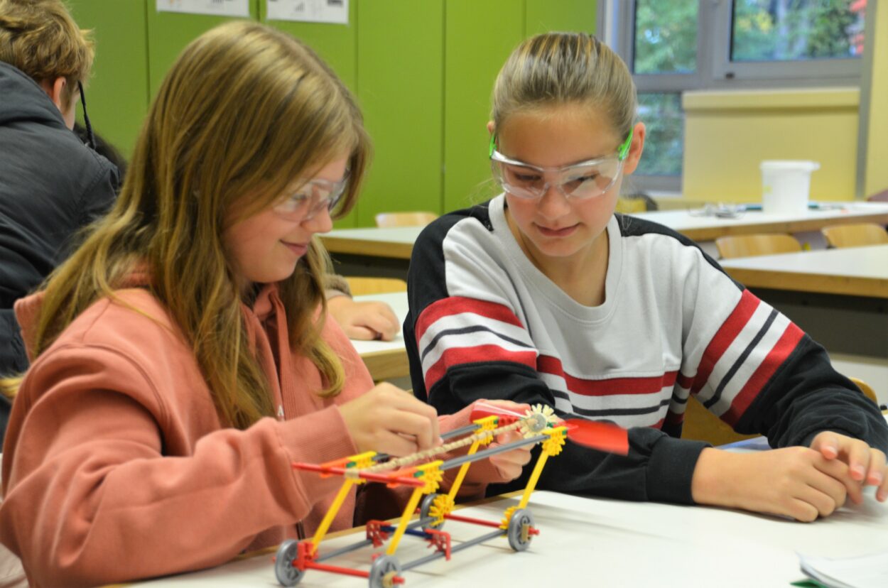Besonders kreativ ist die Einheit „Bewegung und Konstruktion“, die derzeit von den beiden naturwissenschaftlichen Profilkursen der Klasse 7 durchgeführt wird. Jede Stunde gilt es, ein neues Fahrzeug zu konstruieren und es unter verschiedenen Gesichtspunkten zu testen. Dabei müssen physikalische Gesetze und Kenntnisse eingebracht werden. Ihre Wirkungsweise erforschen die Schülerinnen und Schüler durch das Testen ihrer Fahrzeuge.