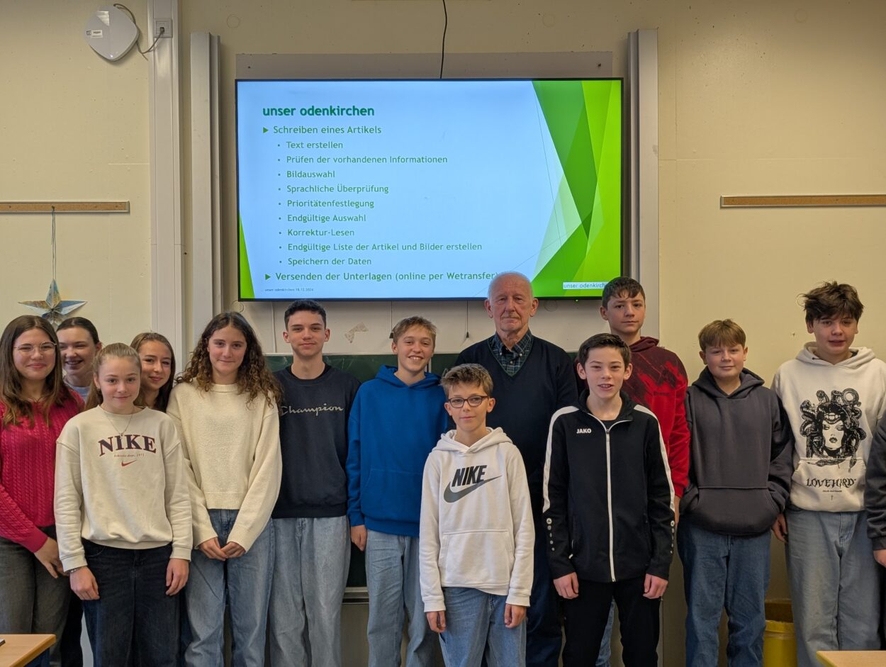 Ähnlich wie das „Brunnenecho“ ist „unser odenkirchen“ als Stadtteil-Zeitschrift bekannt. Hösel schilderte den Schüler*innen sehr anschaulich, welche zahlreichen Arbeitsschritte bei der Erstellung eines Artikels bzw. eines Heftes erforderlich sind. Besonders die planerischen Überlegungen im Vorhinein sowie die zahlreichen Überprüfungs- und Korrekturdurchgänge beim Verfassen eines Artikels beeindruckten die Schüler*innen. Zudem thematisierte Hösel in seinem Vortrag, wie wichtig eine gründliche Recherche und Überprüfung von Informationen seien. Besonders in Zeiten, in denen auch KI eine Hilfestellung für seinen Arbeitsalltag darstellen könne, bedürfe es stets einer gründlichen Überprüfung und Hinterfragung beim Einsatz von künstlicher Intelligenz.