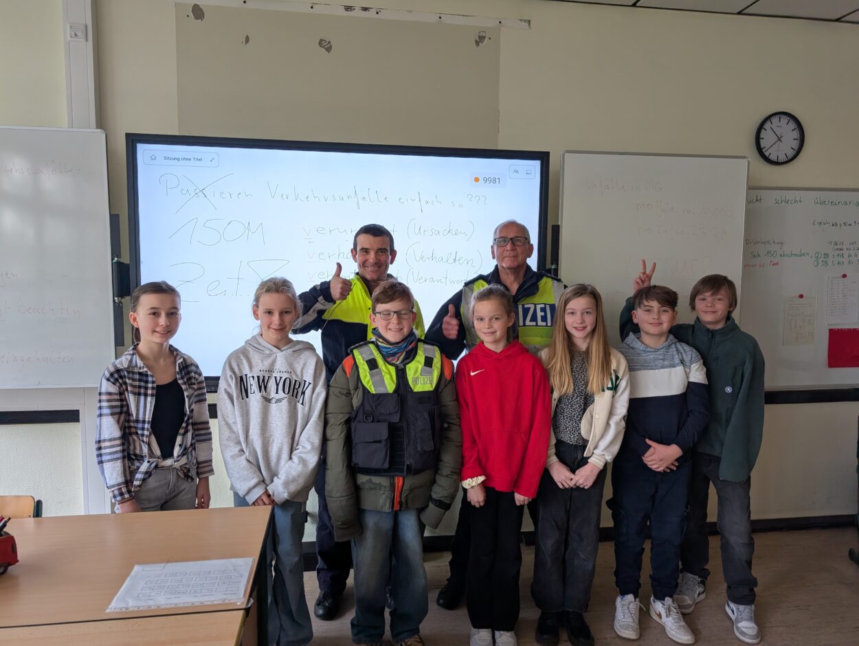In sehr anschaulicher und kindgerechter Form haben sie mit unseren Schülerinnen und Schülern über die sogenannte Formel V gesprochen. Dabei haben die Kinder gelernt, dass Verkehrsunfälle nicht einfach so passieren, sondern durch bestimmte Verhaltensweisen verursacht werden. Falsche Entscheidungen, die in Eile getroffen werden, Ablenkung durch das Handy oder dunkle Kleidung in der dunklen Jahreszeit zählen oftmals zu Ursachen von Verkehrsunfällen.