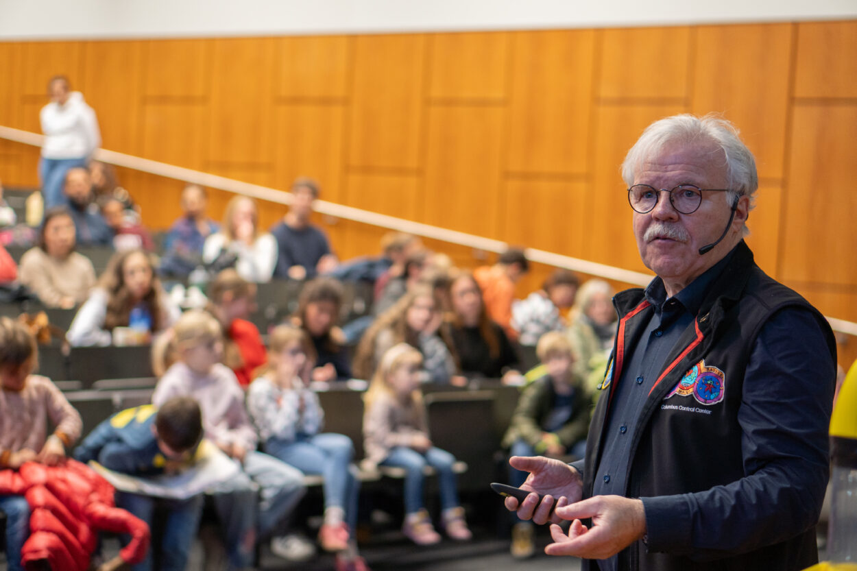 Prof. Dr. Reinhold Ewald berichtete, welche Erfahrungen ihn bereits bei seiner Reise durch das Weltall geprägt haben, gab exklusive Einblicke in seine Erlebnisse als Astronaut an Bord der Sojus TM-24/25 und stand unseren kleinen und großen Forschern Rede und Antwort. Dank seiner lebhaften Erzählungen und anschaulichen Beispiele konnten die Kinder und Jugendluchen einen authentischen Blick auf das Leben im All von der Vorbereitung auf einen Raumflug bis hin zu den Herausforderungen, die während einer Mission im Weltraum auftreten können, erhalten. Daniel und Florian trugen durch ihre authentische Art, ihre professionellen Fragen, ihre Begeisterung und ihr Wissen maßgeblich dazu bei, dass die Veranstaltung für alle Anwesenden zu einem unvergesslichen Erlebnis wurde.