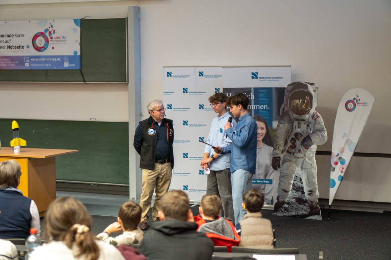 Der krönende Abschluss einer grandiosen Woche war der Vortrag des renommierten Mönchengladbacher Astronauten Prof. Dr. Reinhold Ewald im prall gefüllten Audimax der Hochschule Niederrhein. Durch das Programm führten neben Prof. Dr. Siegfried Kirsch, Pädagogischer Leiter der JuniorUni, zwei 14-jähige, überaus talentierte, sympathische und aufgeweckte Nachwuchsreporter, Daniel und Florian – vom Franz-Meyers-Gymnasium in MG.