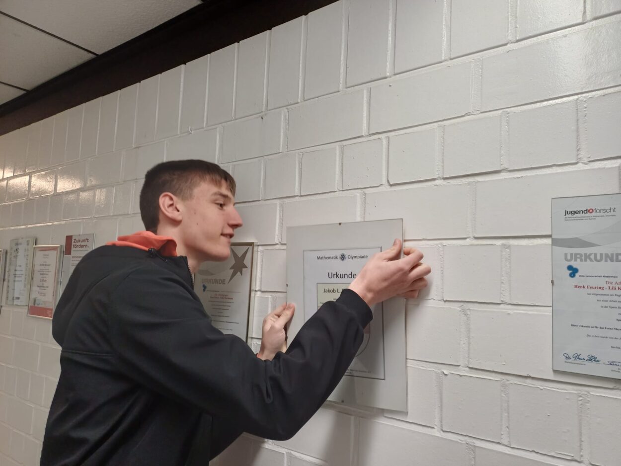 Alte Urkunde gegen neue Urkunde! Jakob Fallentin erhielt bei Herrn Bruder zunächst nur Worte des Lobes und Anerkennung sowie einen kleinen Preis, denn seine Urkunde wurde ihm feierlich in Münster im Schloss überreicht. Jakob hatte sich im Februar für die Landesrunde der Mathematikolympiade qualifiziert. Diese fand in Münster im Wilhelm-Hittorf-Gymnasium statt. Jakob musste eine mehrstündige Klausur mit vier schwierigen Aufgaben lösen. Nach der Klausur gab es dann für alle Matheolympioniken ein schönes Programm mit gemeinsamen Essen und verschiedenen Spielen – alle mit mathematischem Hintergrund wie Strategie oder Ballonfiguren. Jakobs Klausur war so gut, dass er einen zweiten Platz erzielte. Daher durfte er noch ein zweites Mal nach Münster reisen und erhielt diesmal seine Urkunde – verziert mit Reden, spannenden mathematischen Vorträgen, Rätseln und Preisen. Eine Kopie der Urkunde hängt nun im Gang der Schulverwaltung und Jakob durfte die dort platzierte Urkunde von Paul Pfeifer selber austauschen! Jakob ist ein sehr würdiger Nachfolger!