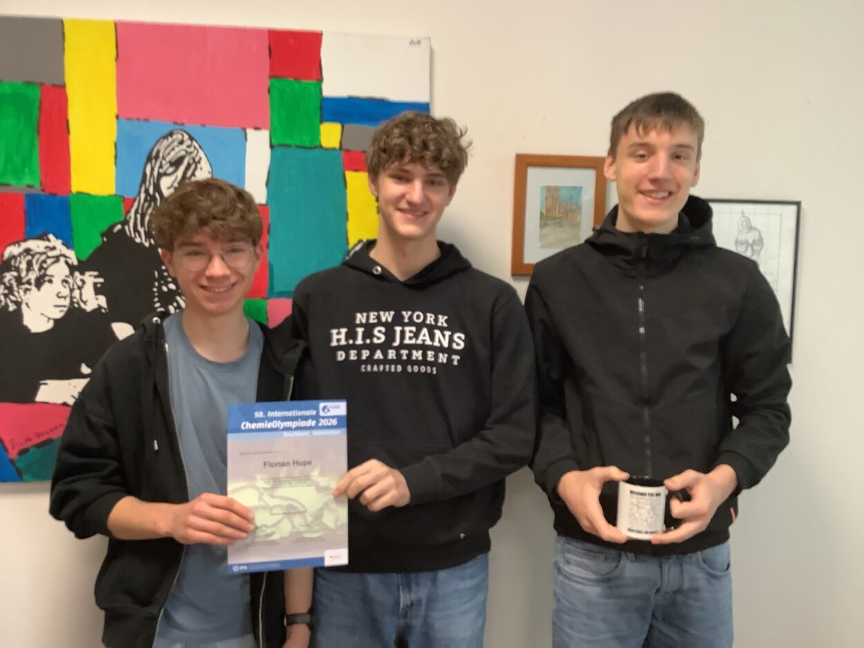Zunächst der klassische Weg des Überreichens. Herr Bruder konnte Florian Hupe und Mika Leidel für die Teilnahme an der IJSO (Internationale Junior Science Olympiade) eine Urkunde überreichen. Beide erreichten die zweite Runde. Florian ist sogar unter die besten 300 Teilnehmenden in Deutschland gekommen und wird Anfang Mai die Klausur der dritten Runde schreiben. Dazu drücken wir ihm alle Daumen. Florian erhielt zusätzlich noch eine Urkunde für die Teilnahme an der IChO (Internationale Chemieolympiade). Hier erreichte er die zweite Runde. Neben der Urkunde hat Florian nun die Möglichkeit an verschiedenen Workshops teilzunehmen. Während er im letzten Jahr fünf verschiedene Workshops der IChO NRw besuchte, hat er sich in diesem Jahr aufgrund der ZP 10 und als Mitglied des JuPa nur für einen Workshop entschieden. Im Juni geht es zum Max-Planck-Institut nach Mülheim. Vorgesehen ist auch, dass Nobelpreisträger Benjamin List Zeit für die Olympioniken hat. Spannend! Gerade ist die neue Runde der IChO gestartet. Interessierte melden sich bei Frau Küsters. Dieses Mal geht es rund um das Thema Bubble Tea – Einstiegstrainings dazu finden an der Uni Düsseldorf statt.